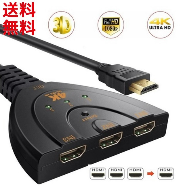 HDMI切替器 3入力1出力 HDMI分配器 自動切替 フルHD対応 HDDレコーダー,DVD,パソコン,PS3,TV,3D / 1080P / 4k 送料無料
