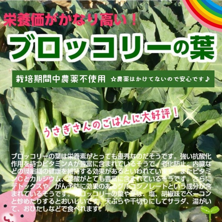 こちらのブロッコリーの葉は、露地栽培で、有機肥料をいっぱい入れて、栽培期間中農薬不使用・化学肥料不使用で育てられた野菜です。ブロッコリーの葉は栄養価がかなり高く、うさぎさんのごはんに大好評です!ブロッコリーの葉は栄養素がとっても優秀なのだそうです。強い抗酸化作用を持つビタミンAが豊富に含まれているそうで、老化防止、内臓などの膜組織の健康を維持する効果があるといわれています。またビタミンCとカルシウム、葉酸がとても豊富に含まれているそうです。さらにデトックスや、がん予防に効果のあるグルコシノレートという成分が含まれているそうです。ブロッコリーの葉や茎は、塩、胡椒味でベーコンと炒めたりするとおいしいです。天ぷらや千切りにしてサラダ、湯がいて、おひたしなどで食べれます。