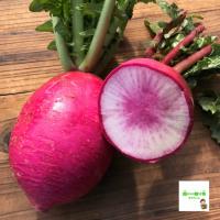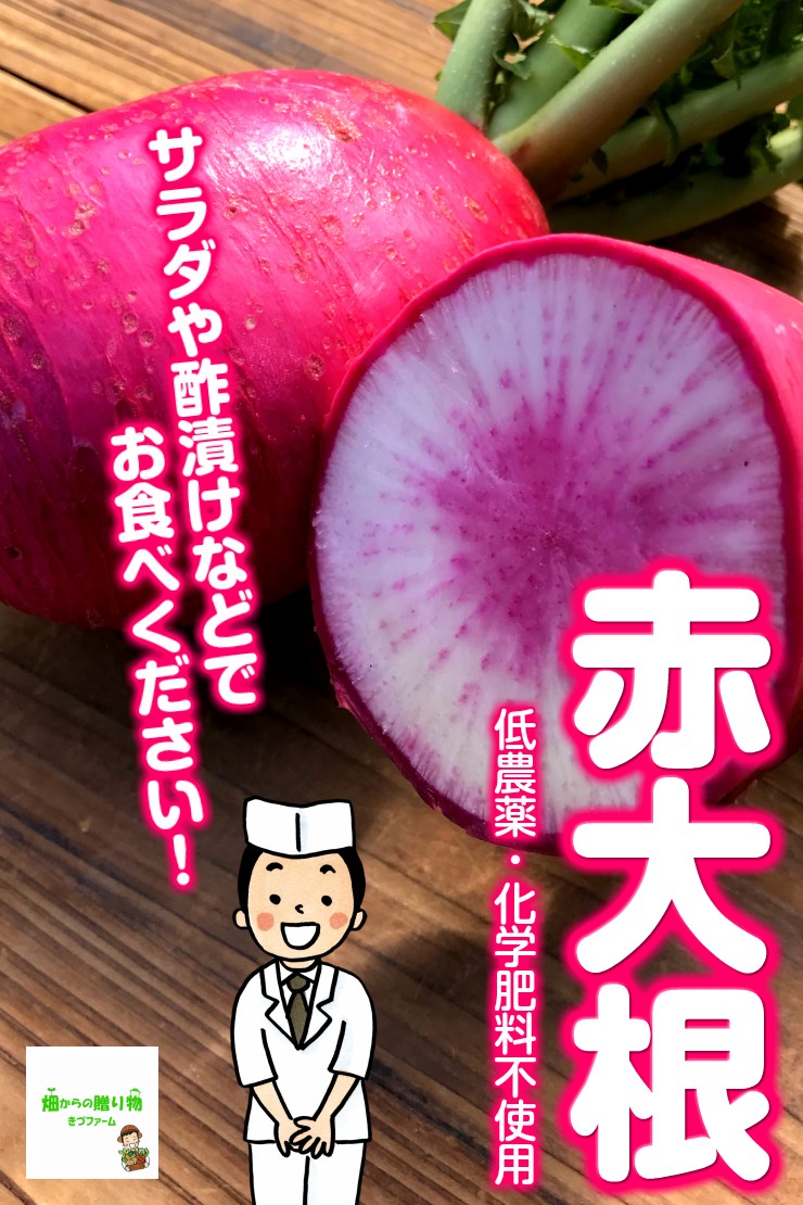 こちらの赤大根は、露地栽培で、有機肥料を入れて、栽培期間中農薬節減(低農薬)・化学肥料不使用で育てられた野菜です。サラダや酢漬けなどでお食べください!