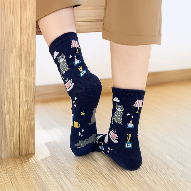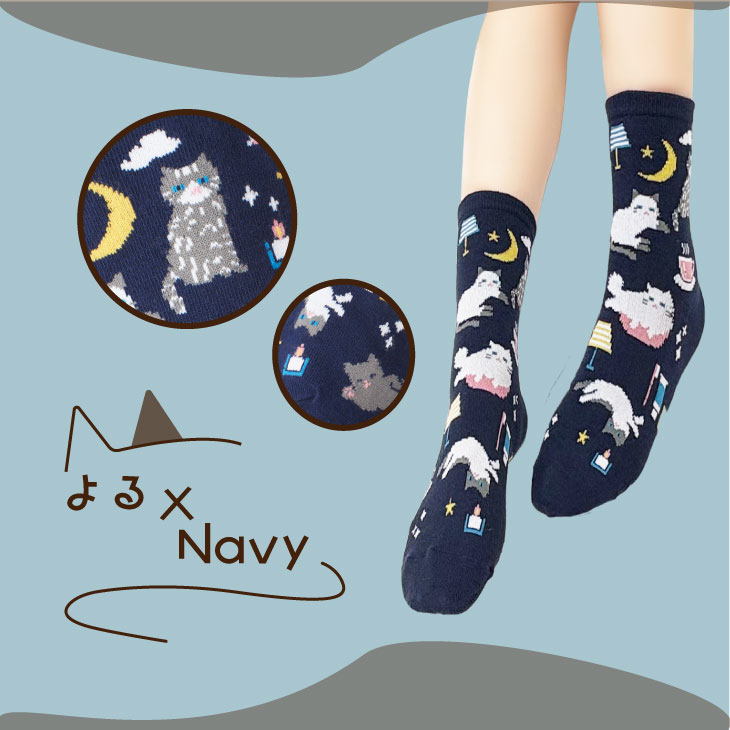 カフェ・よるを気ままにゆったりしている姿が可愛いデザインの靴下です。足元を見るたびに癒されちゃう♪