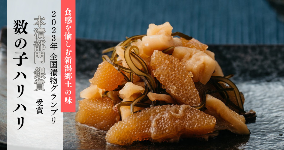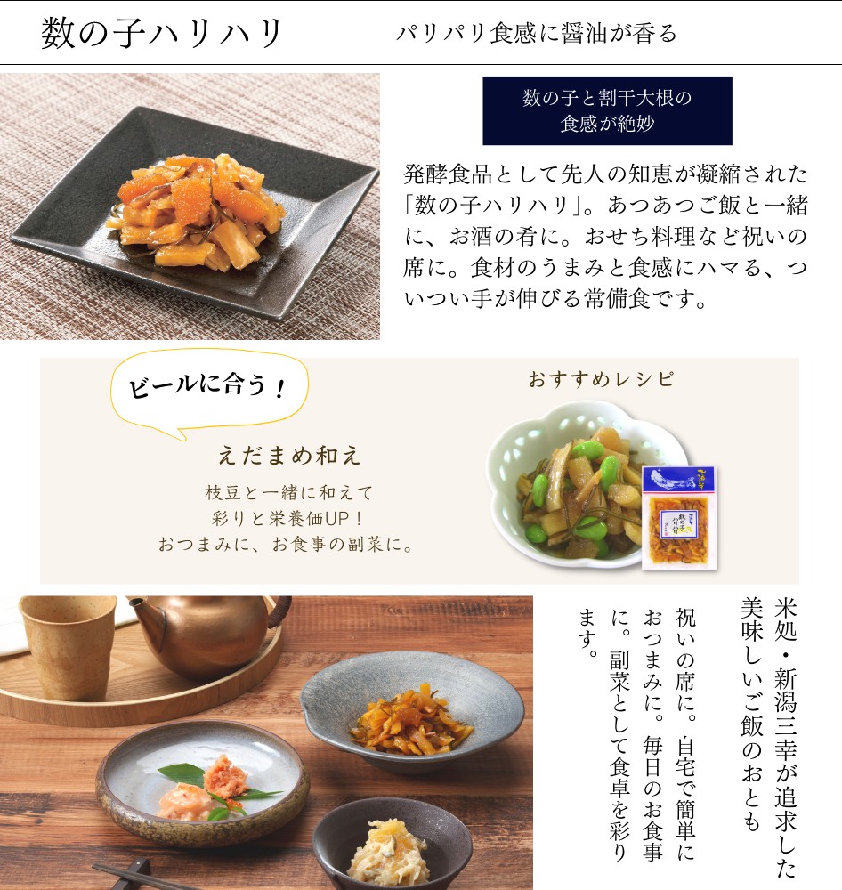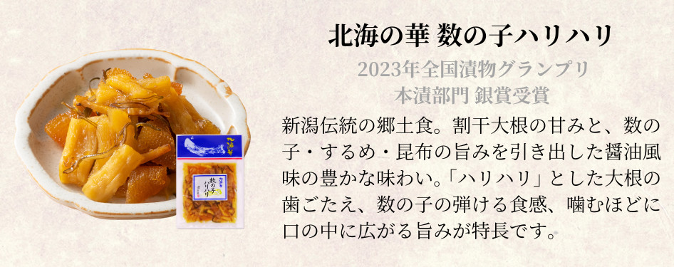 雪国新潟の保存食として古くから伝わる郷土料理です。割干大根の甘みと、数の子・するめ・昆布の旨みを引き出した醤油風味の豊かな味わい。「ハリハリ」とした大根の歯ごたえ、数の子の弾ける食感、噛むほどに口の中に広がる旨みが特長です。