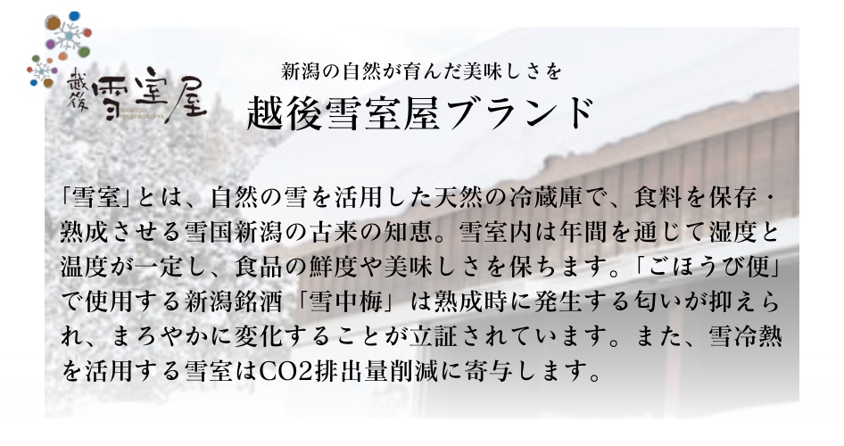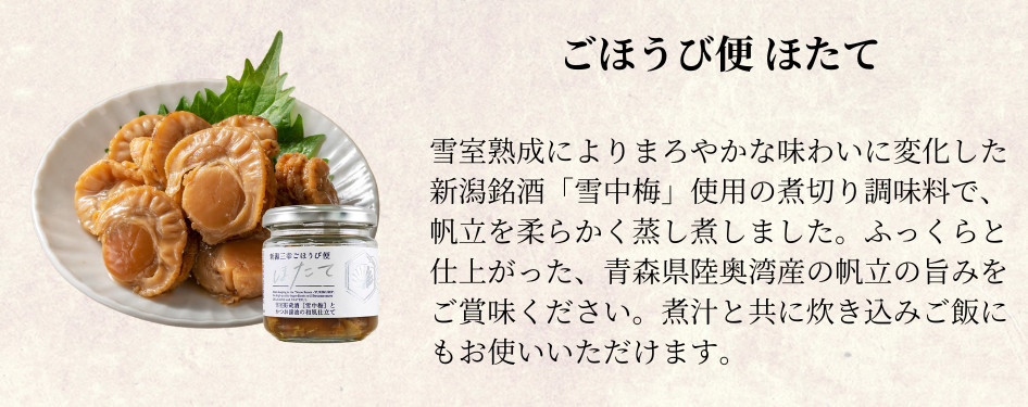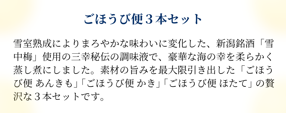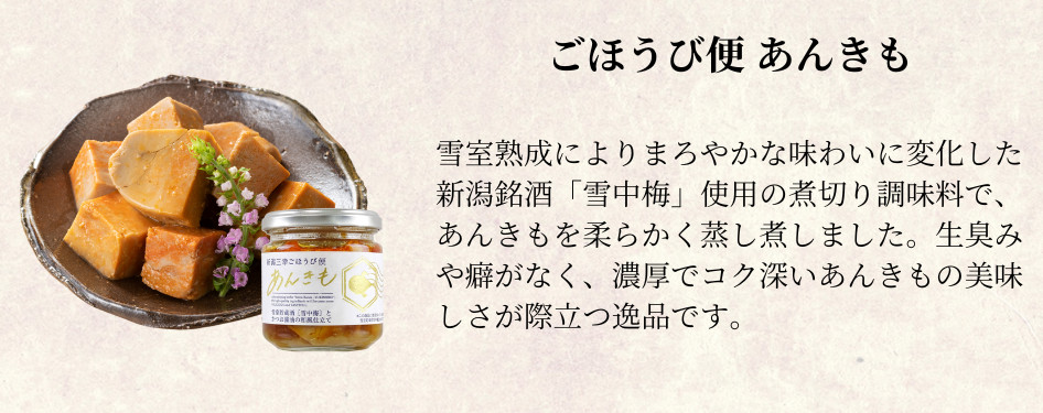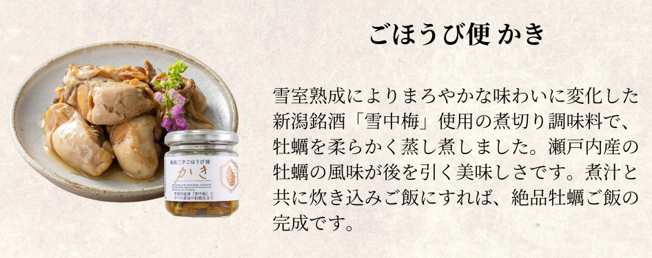 越後雪室で熟成した新潟銘酒「雪中梅」を使用した煮切り調味料で蒸し煮した「ごほうび便 あんきも」「ごほうび便 ほたて」「ごほうび便 かき」の豪華海の幸3種。素材の旨みを最大限に引き出し、まろやかな味わいに仕上げました。