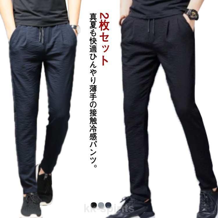 【2枚セット】 冷感パンツ メンズ 接触冷感 ロングパンツ シワ感 薄手 ひんやり 涼しい ストレートパンツ 細身 スキニーパンツ 夏