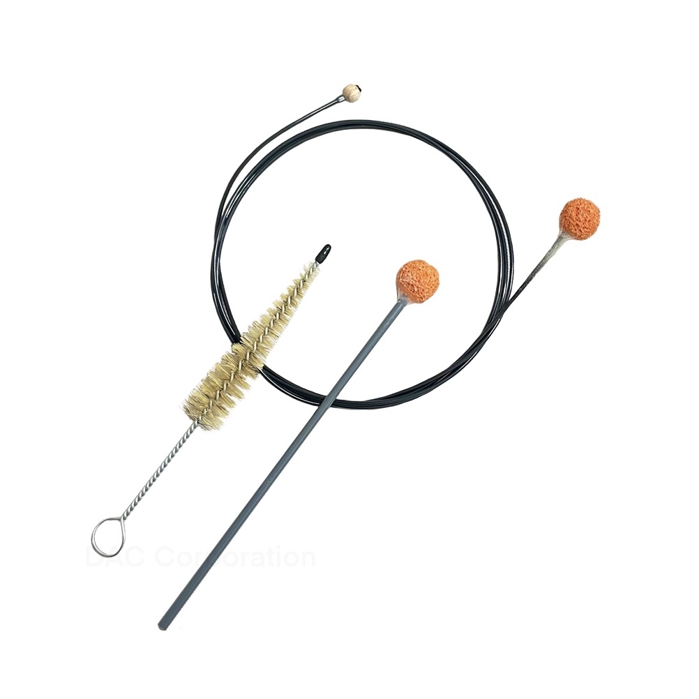 管の太さにぴったりのスポンジ付きクリーニングコード、クリーニングロッドとマウスピースブラシのセット。