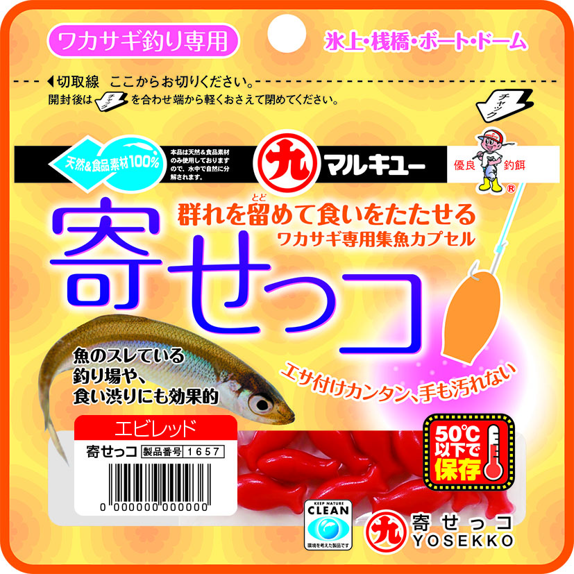 魚の形をしたカプセルにワカサギが好むエキスを濃縮。仕掛けの一番上のハリなどに付け、くびれ部分をカットして使用。成分が溶出してワカサギの群れを足止めし、食い気を持続させます。色は濃縮エキスたっぷりでどんな釣り場にも対応可能な「ナチュラルオレンジ」に、深場や動物系プランクトンの多い釣り場に強い「エビレッド」、藻場や植物系プランクトンの多い釣り場に効果的な「クロレラグリーン」です。魚のスレている釣り場や食い渋った状況にも効果的。