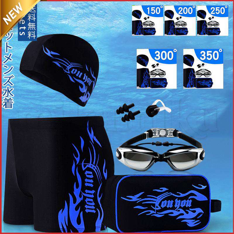 メンズ 水着 6点セット近視用 度付き 競泳 フィットネス水着 ゴーグル スイムキャップ ミラーゴーグル付き 大きいサイズ -1.5 -2 -2.5