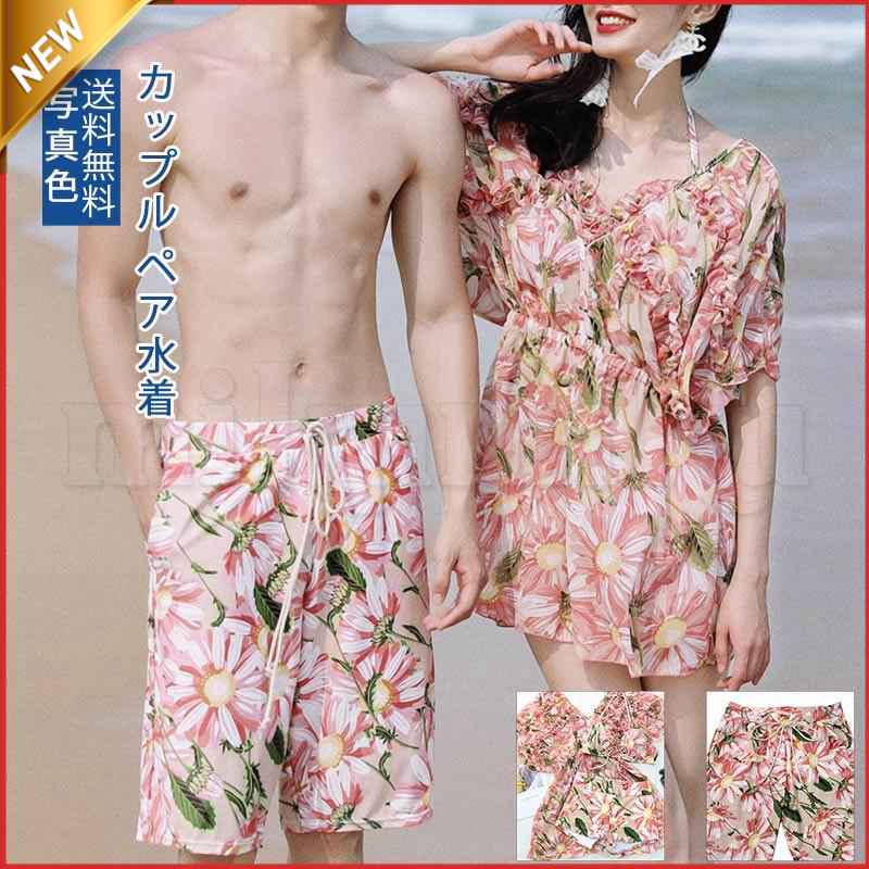 男女セット花柄 ペア水着 4点セット 水着 ペアルック 総柄 ラッシュガード ワンピース ビキニ パンツ カップルお揃い メンズ 結婚祝い大人