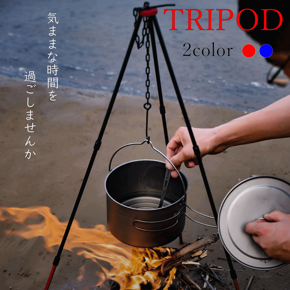 トライポッド アウトドア 三脚 ファイヤースタンド 焚き火 料理 赤 青 2色 カラーバリエーション 送料無料