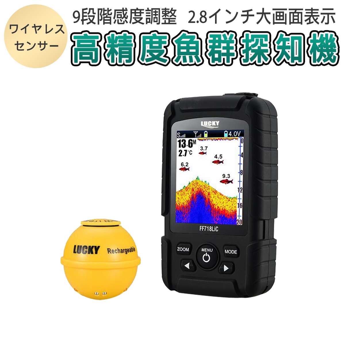 ・LUCKYLAKERワイヤレスポータブル魚群探知機は無線操作距離最大100mまで。探知感度は1から9段階まで調整できます。水の状況によって、感度調整し、正確に魚を探知できます。