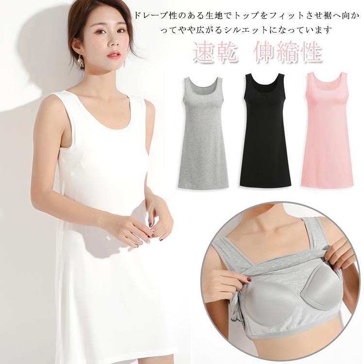 インナーキャミソールワンピース カップ付き スリップ 接触冷感 透け防止 インナー キャミソールカップ付き キャミソール ショート スリップ 白グレー ベージュ