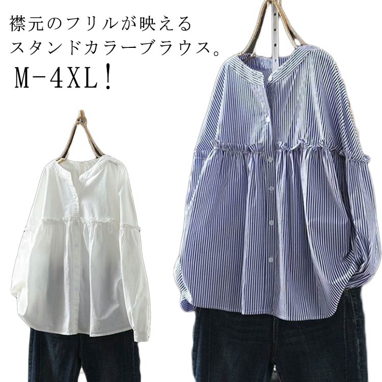 シャツブラウス フリル スタンドカラー フリル 無地 トップス 長袖 立ち襟 ストライプ ブラウス レディース ゆったり フェミニン 仕事 オフィス カジュアル 大人