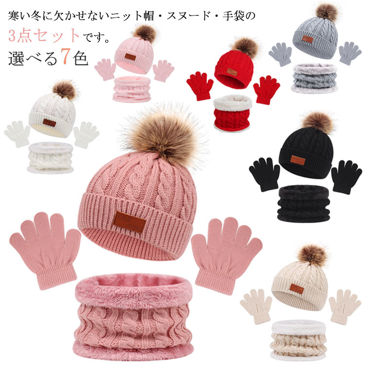 【3点セット】 ニット帽 スヌード 手袋 キッズ マフラー 子供用 帽子 グローブ 女の子 男の子 秋 冬 ニットキャップ ネックウォーマー ワッチキャップ ポンポン