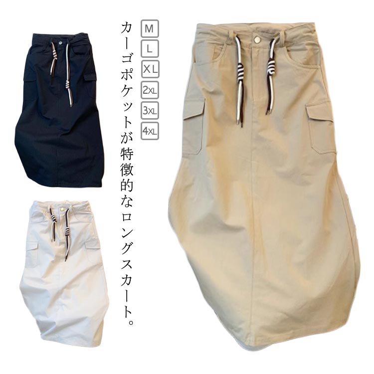 カーゴ ロングスカート ボトムス スカート カーゴスカート 半袖シャツ 大きいサイズ 体型カバー マキシスカート レディース スリット入り アイボリー コットン