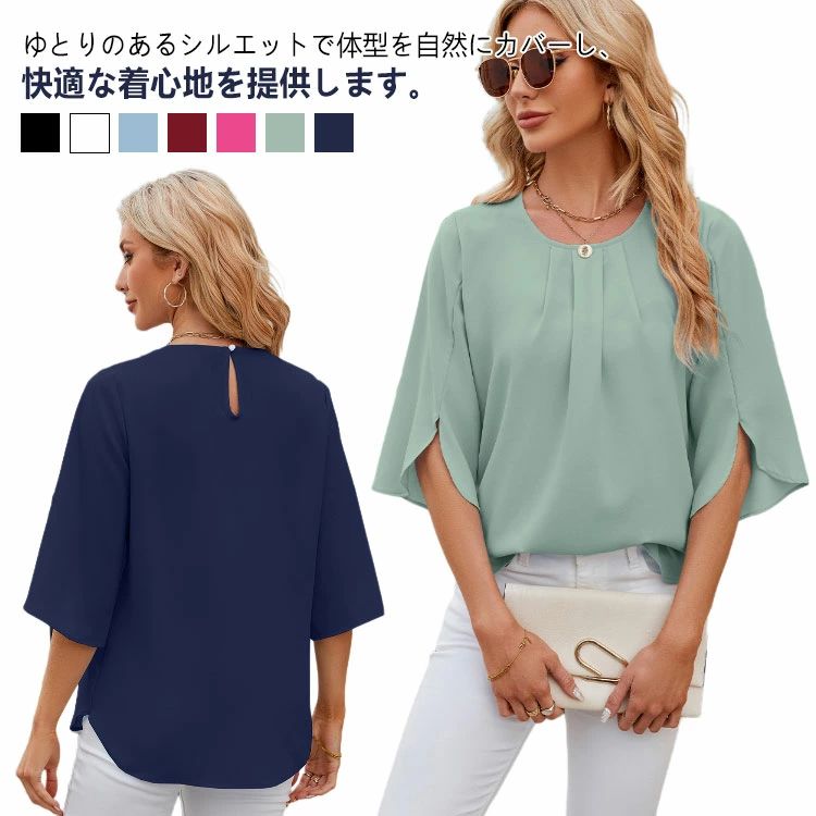 シャツ シフォンブラウス 五分袖 スリットスリーブ プルオーバー レディース ブラウス タックブラウス 春夏 グリーン トップス 丸首 服 ブラウス オフィス カジ