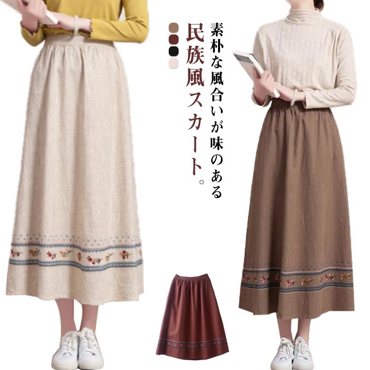 膝下 ロングスカート スカート 刺繍 エスニック 民族風 ミモレスカート レディース リネン風 スカート スカート 綿麻風 ウェストゴム アジアン おしゃれ ボトム