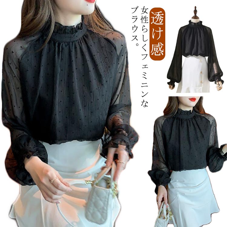 ブラウス とろみ ぽわん袖 ハイネック プルオーバー バルーン袖 ブラウス 長袖 きれいめ ドット フリルネック フォーマル シャツ 春 透け感 オフィスカジュアル