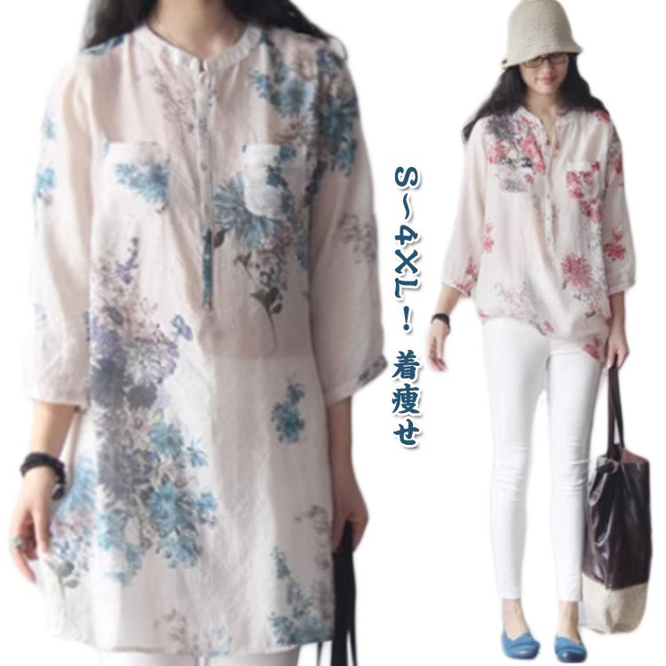 ロングシャツ 薄手 大人 チュニック ロングブラウス スタンドカラー チュニック 女性 春 7分袖 ゆったり 着痩せ 夏 可愛い カジュアル 大きいサイズ きれいめ 体