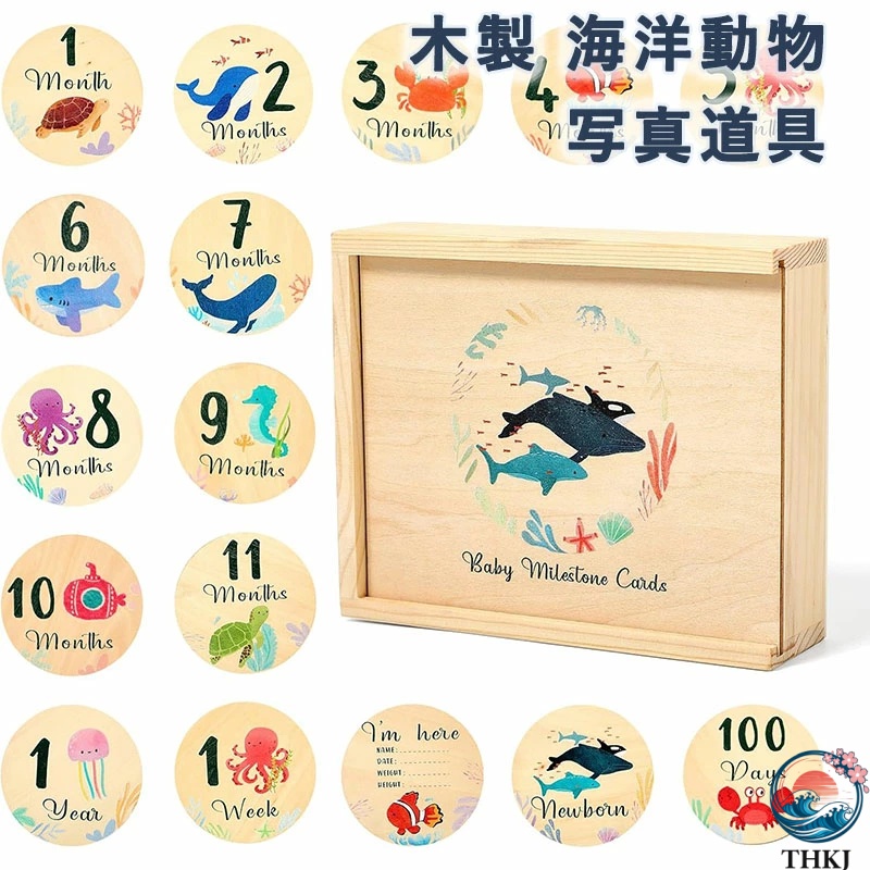 月齢フォト 木製 海洋動物 ベビーマンスリーカード 8枚セット 収納箱付き 赤ちゃん ニューボーンフォト ウッド 写真道具 新生児 誕生100日 成長記録 天然木材 出