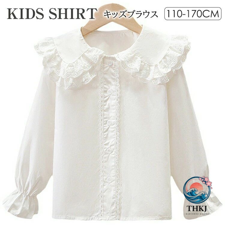 子供服 シャツ 女の子 ブラウス ホワイト 白 長袖 春秋 無地 レース ジュニア 110 120 130 140 150 160 170cm 通園 通学 発表会 フォーマル かわいい フリル付き