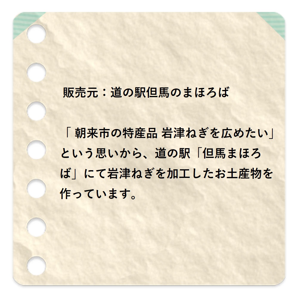 「 朝来市の特産品 岩津ねぎを広めたい」という思いから、道の駅「但馬まほろば」にて岩津ねぎを加工したお土産物を作っています。
