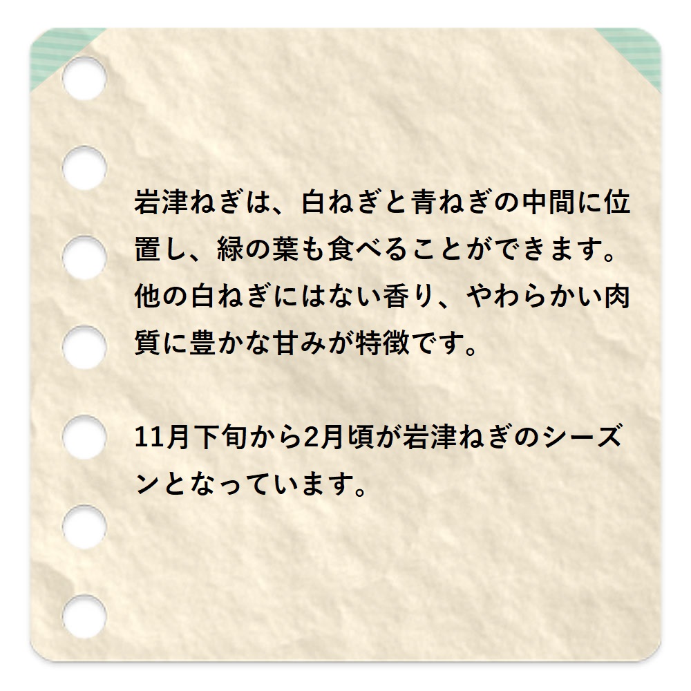 岩津ねぎは白ねぎと青ねぎの中間に位置し、緑の葉も食べることができます。他の白ねぎにはない香り、やわらかい肉質に豊かな甘みが特徴です。