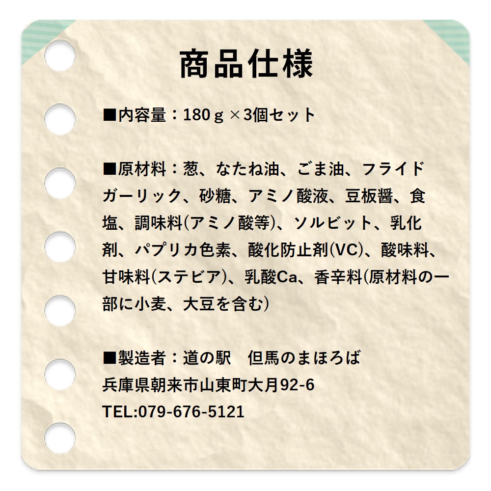 ■原材料:葱、なたね油、ごま油、フライドガーリック、砂糖、アミノ酸液、豆板醤、食塩、調味料(アミノ酸等)、ソルビット、乳化剤、パプリカ色素、酸化防止剤(VC)、酸味料、甘味料(ステビア)、乳酸Ca、香辛料(原材料の一部に小麦、大豆を含む)
