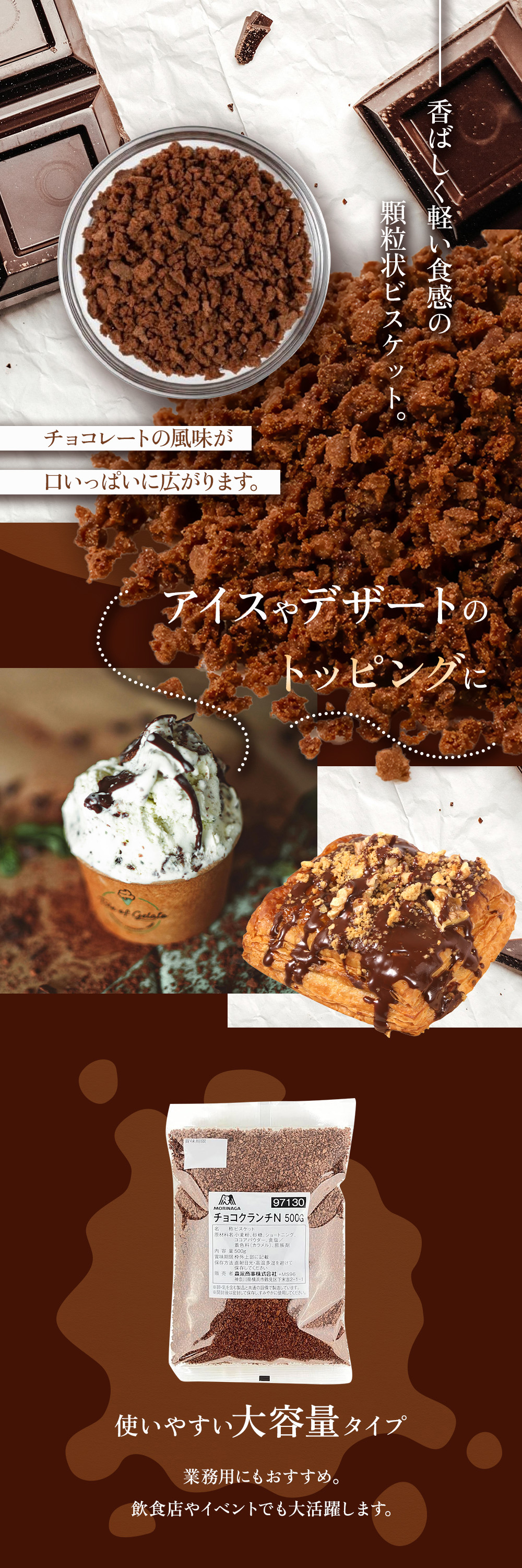 サクサクとした食感でアイスやデザートのトッピングなどにご利用いただけます。