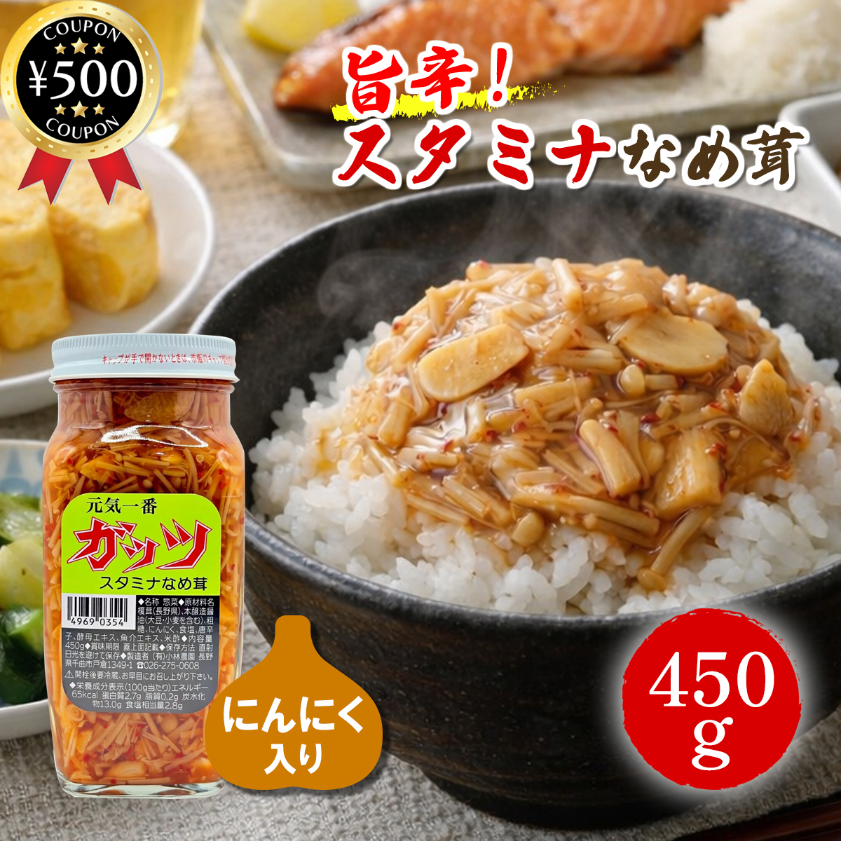 小林農園 ガッツなめ茸(にんにく&唐辛子入り) 450g 瓶 国産 旨辛 ピリ辛 旨味 ご飯のお供 スタミナ 惣菜 調味料 大容量 食品