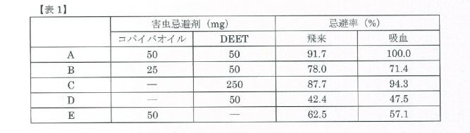 表1に示す割合(mg)で害虫忌避成分(コパイバオイル、DEET)をサンプル処理綿布に染みこませ、