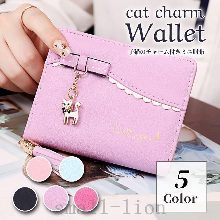 財布レディース二つ折二つ折り財布可愛い子供財布子供財布女の子おしゃれ猫チャーム付タッセル付リボンキッズ子ども財布二つ折りウォレット