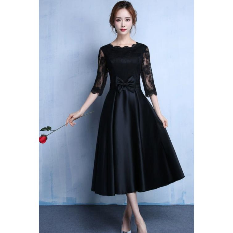 パーティードレス 袖あり 結婚式 ワンピース ドレス レース aライン ミディアム丈ドレス 黒 大きいサイズ お呼ばれ 二次会 発表会 服 20代