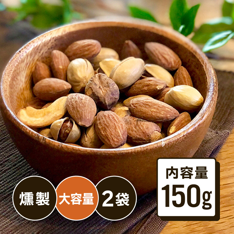 燻製の香り高いカシューナッツ・アーモンド・ピスタチオのミックスナッツです。