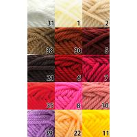 アクリルを原料段階で染色した後、紡績とバルキー加工(膨らむ加工)を施していますので、ソフトでふっくらしたボリューム感のある糸に仕上がっています。洗濯しても縮まず、乾燥が早く『膨らみ』の復元性は抜群です。抗菌防臭加工でとっても清潔!