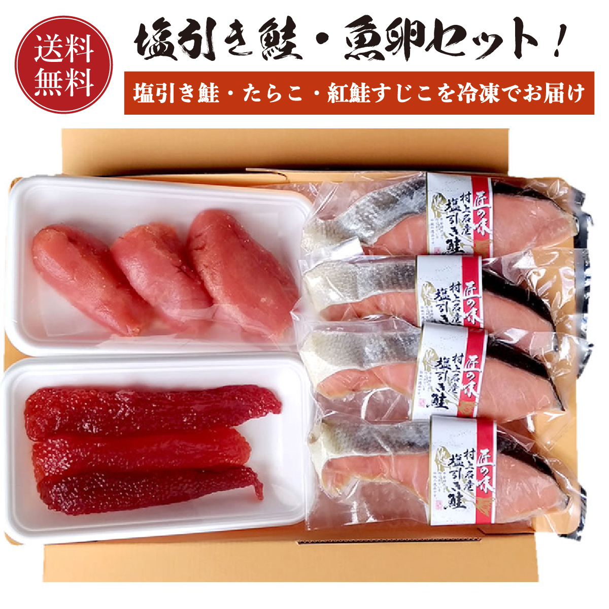 村上塩引鮭(真空パック)×4 切・たらこ 200g・紅鮭筋子 125g