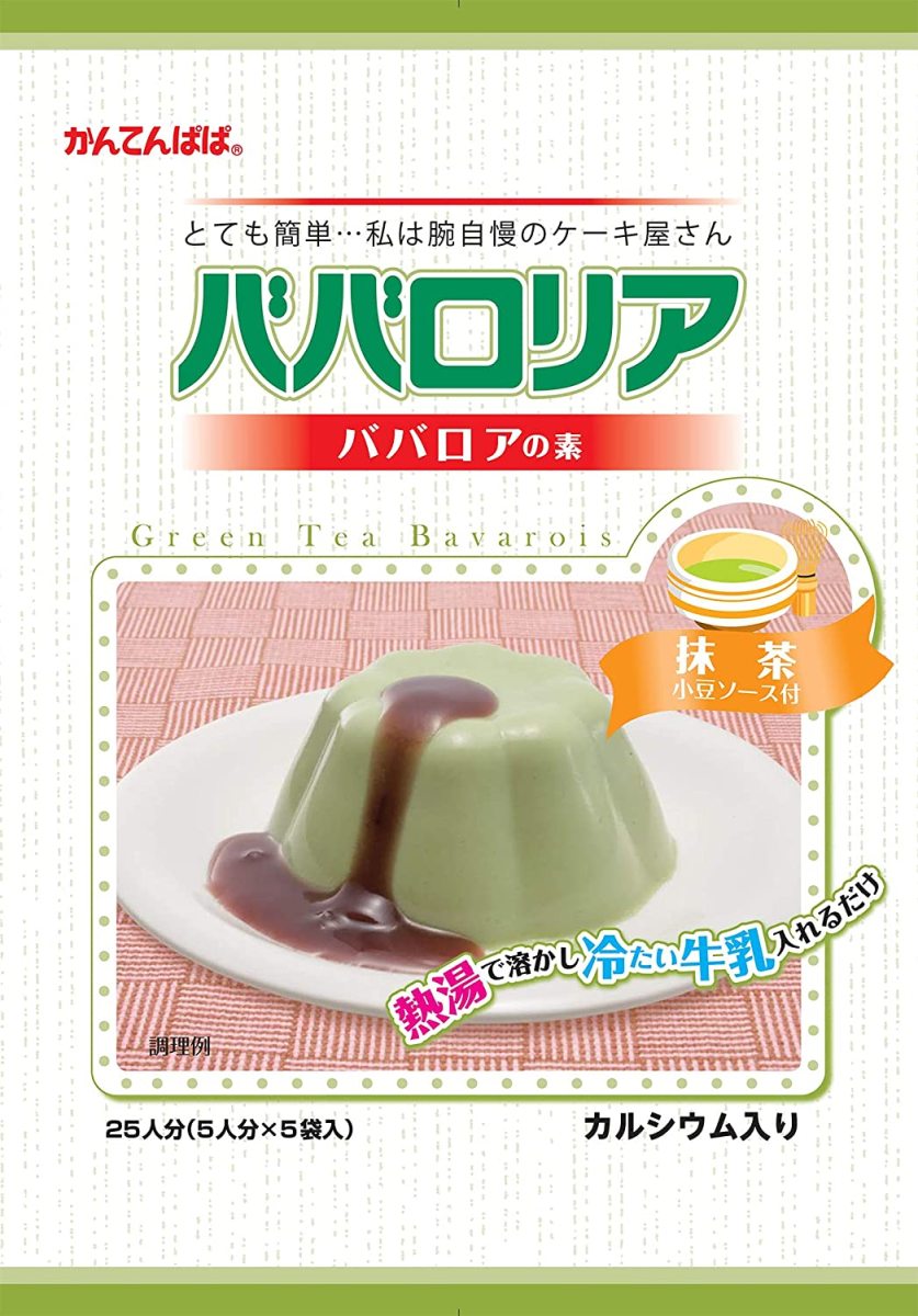 原材料:<ババロアの素> 糖類(ぶどう糖、砂糖)、植物油脂、ゼラチン、抹茶、脱脂粉乳、寒天、食塩、貝カルシウム、