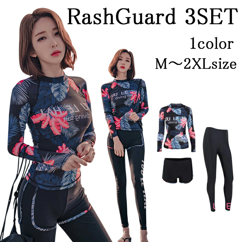 | □商品詳細 | | 高品質で伸縮性のあるとってもお洒落な ボタニカル柄ラッシュガード 3点セットです。