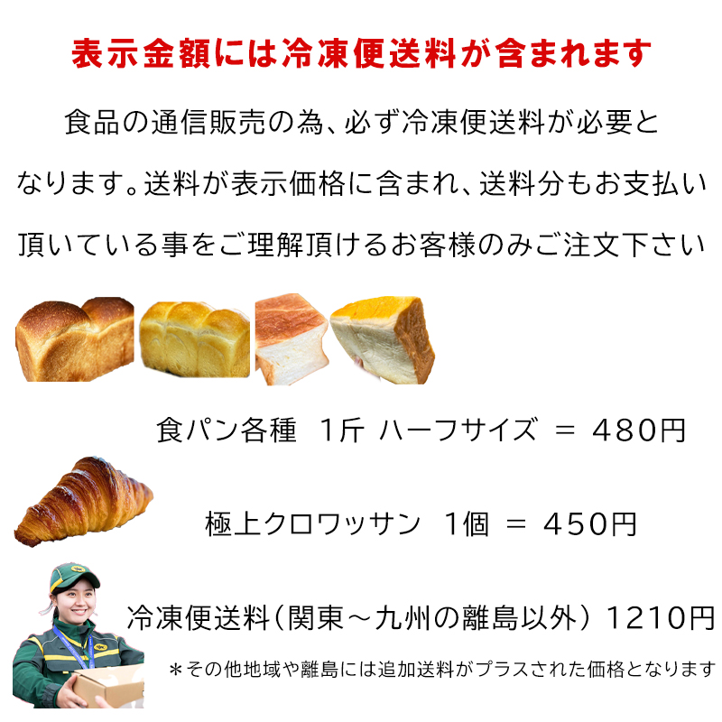 商品レビューにて 価格が高い と言うお叱りを受ける事が御座います。お代金内訳は ”パン代金(レコルトのパンお代金)+冷凍便送料(ヤマト運輸代金)=お支払いお代金” となります。私共レコルトは大手パン工場では御座いません事から、配送代金が高くなり申し訳御座いません。送料が商品お代金内訳に加わっております事をご理解のほどご注文を宜しくお願い致します。 関東地域から九州地域までのクール便送料は商品代金に含まれております。また別途、北海道700円、東北400円、沖縄・離島900円の追加送料が加算されます
