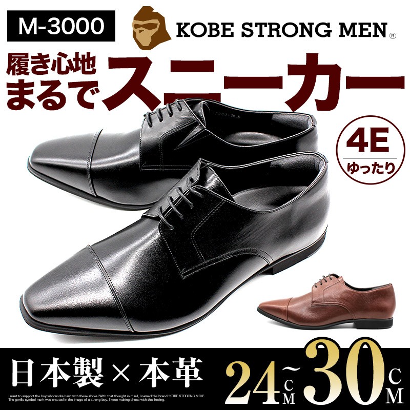 神戸ストロングメン ビジネスシューズ 本革 レザー 日本製 ストレートチップ メンズ 革靴 4EEEE 甲高 幅広 軽量 紳士靴 神戸 M-3000