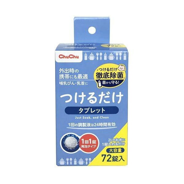 哺乳びん・ベビー用食器など赤ちゃんが使うものを洗浄後、溶けやすい発泡タイプのタブレットを溶かした液につけるだけで除菌できます。1日1回2Lの水道水に1錠を入れてつくるだけで何回も除菌できます。