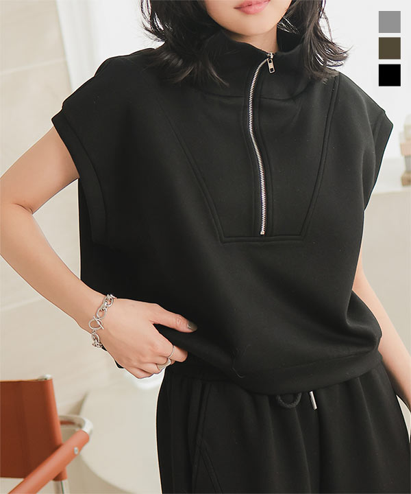 トレンドのハーフジップを盛り込んだハイネックベスト。