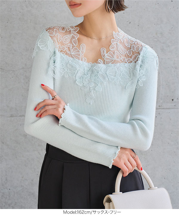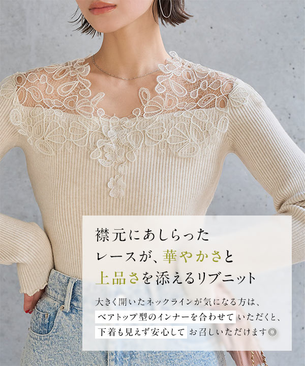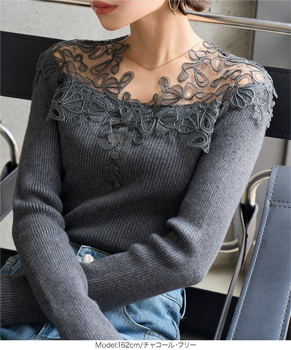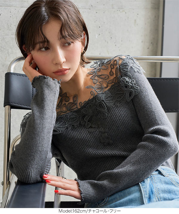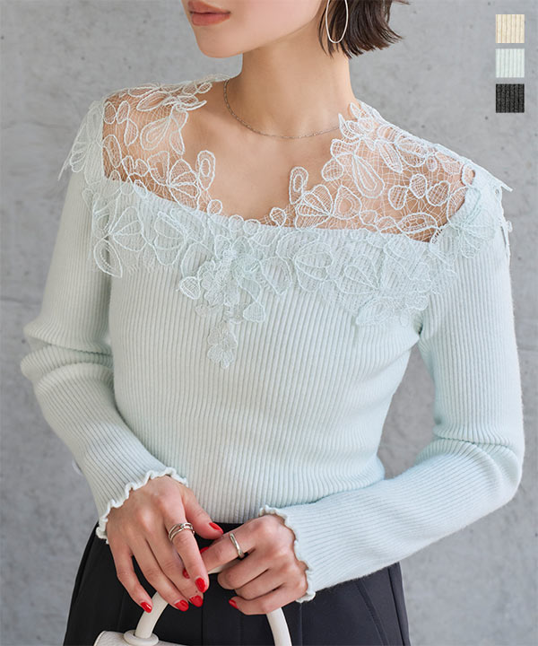 大ぶりの胸元レースが目を惹く、高見えオフショルリブニット。