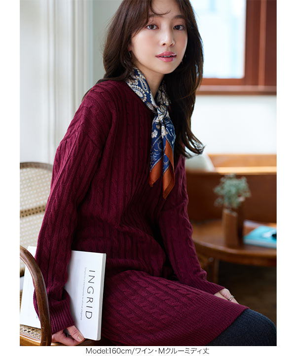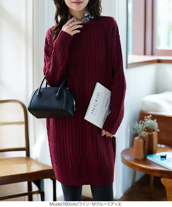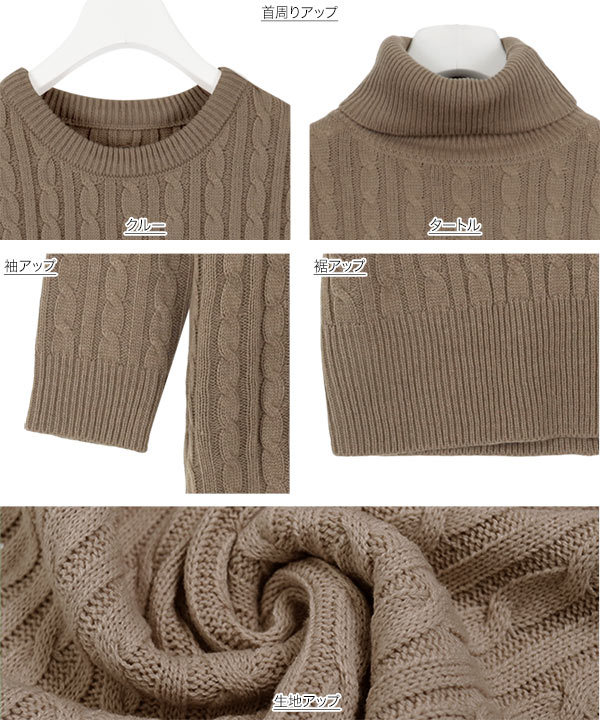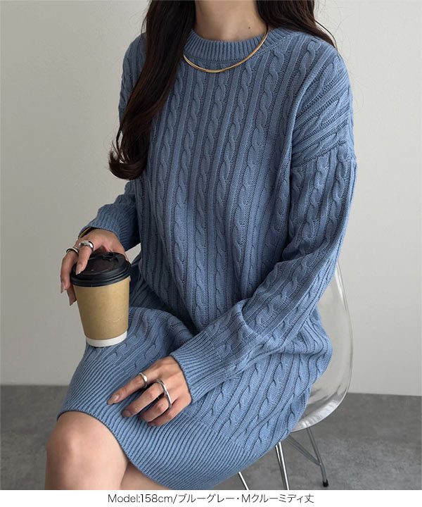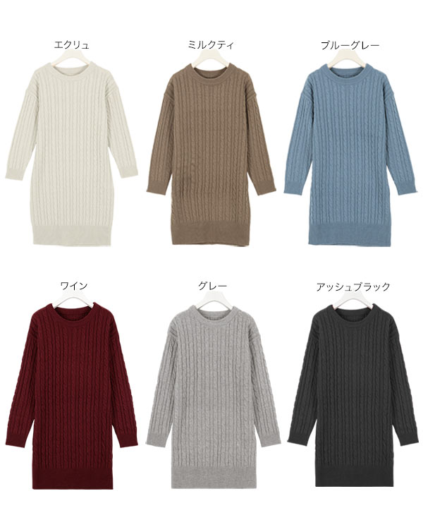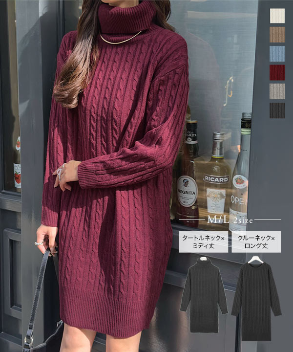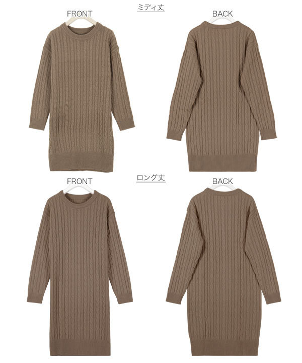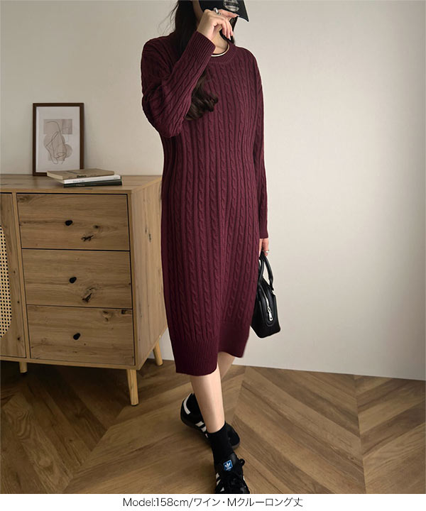 選べる2丈&2ネックタイプ総ケーブル編みニットワンピース