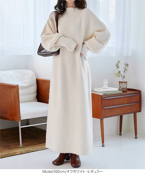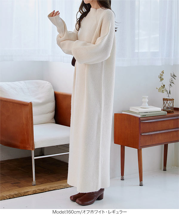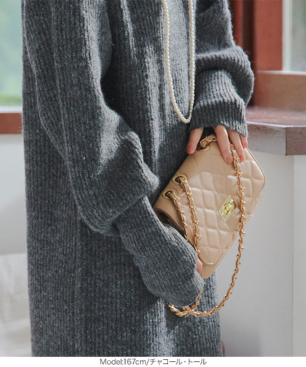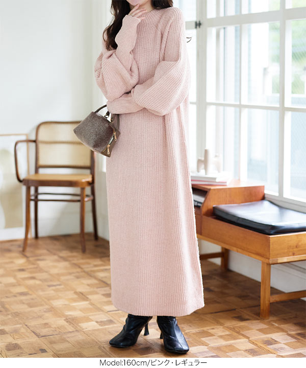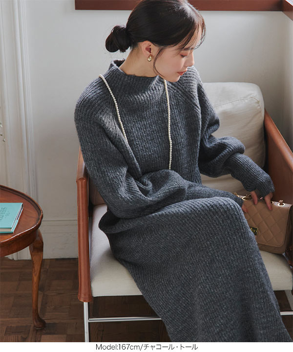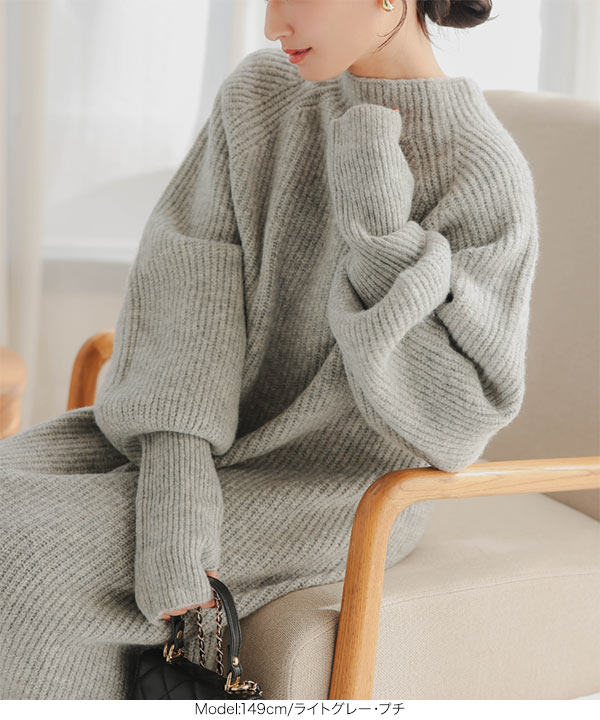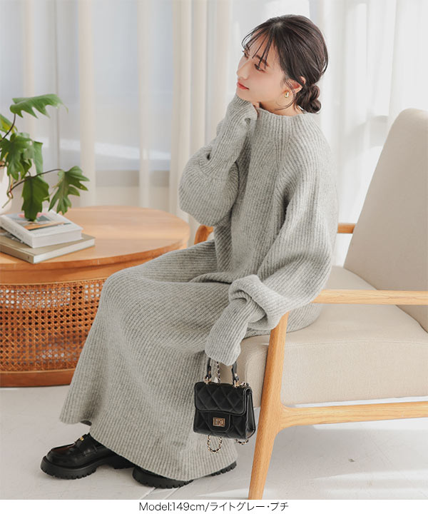 リラックス感がありラフでいて女っぽいボトルネックニットワンピース。