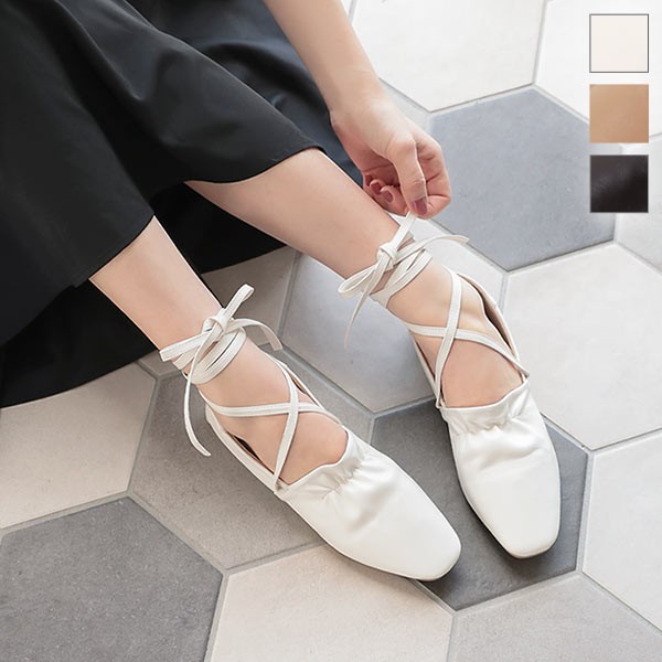 パンプス レースアップ 春 スクエアトゥ ギャザー フラット ぺたんこ 歩きやすい 白 黒 レディース 靴 シューズ I2030