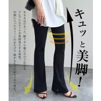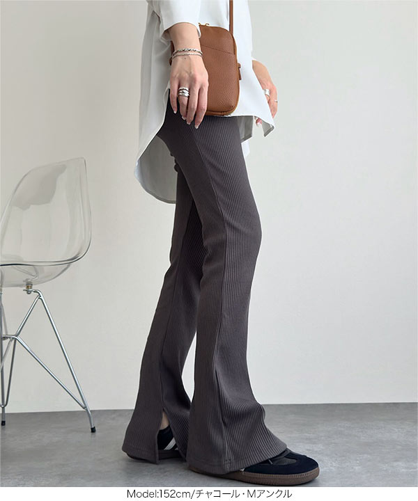 目玉セール 足長 サイドスリットフレアリブパンツ レディース ボトムス ストレッチ レギンス 細リブ 無地 ウエストゴム フレア裾 M2807送料無料