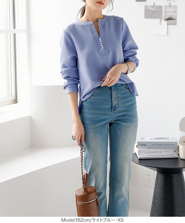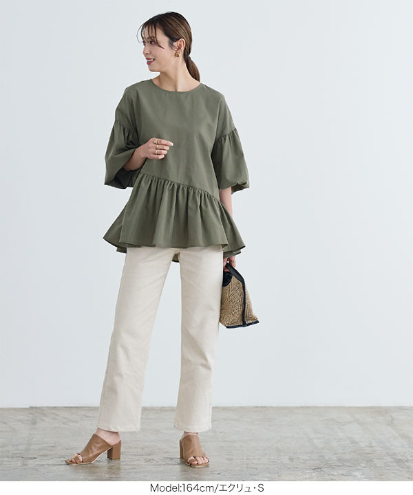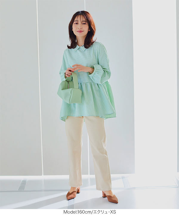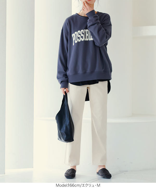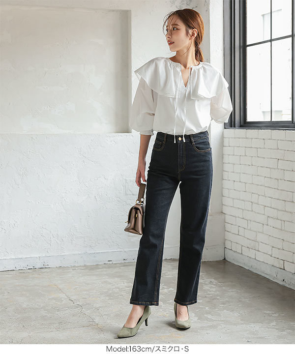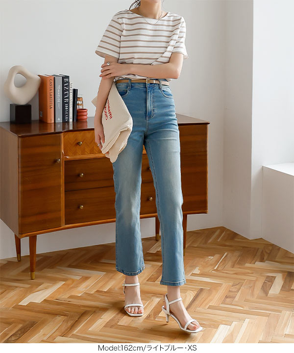 ハイウエストなのでトップスインも様になり、スタイルアップ見え効果も◎。