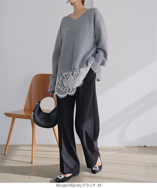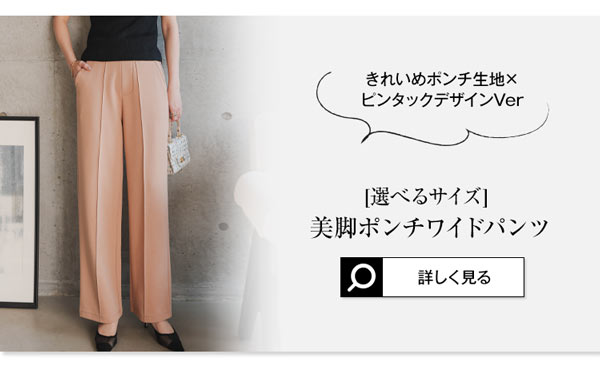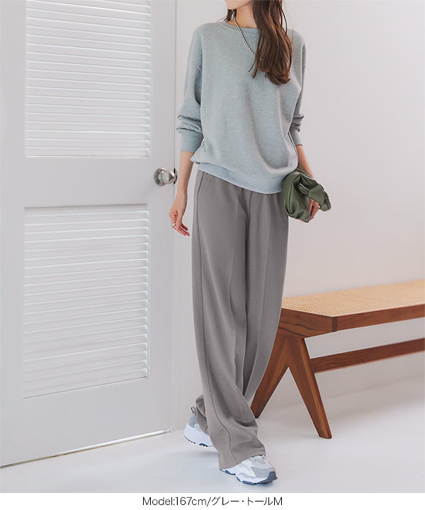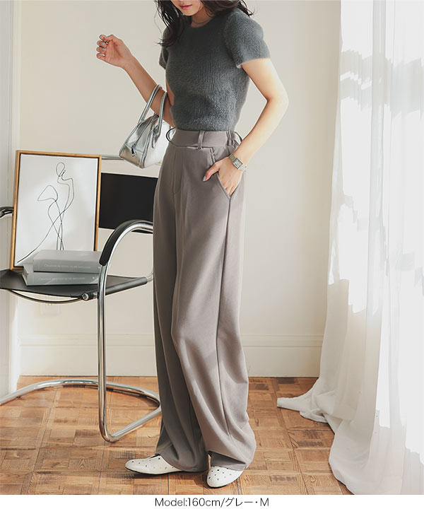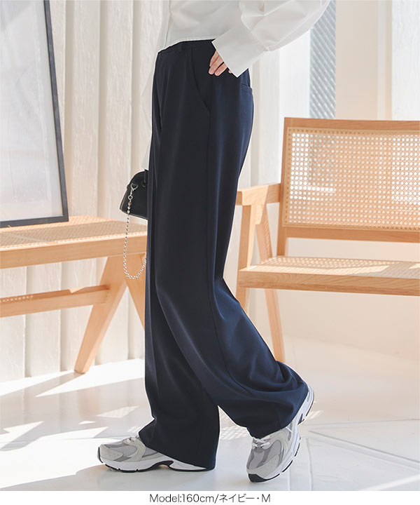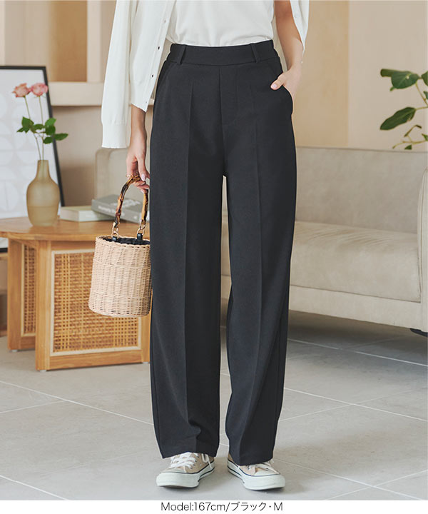 下半身のラインをカモフラージュするセンタープレス&ゆとりを持たせたシルエットで、だれでも美脚見えを叶えます。