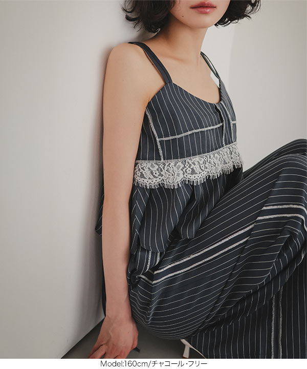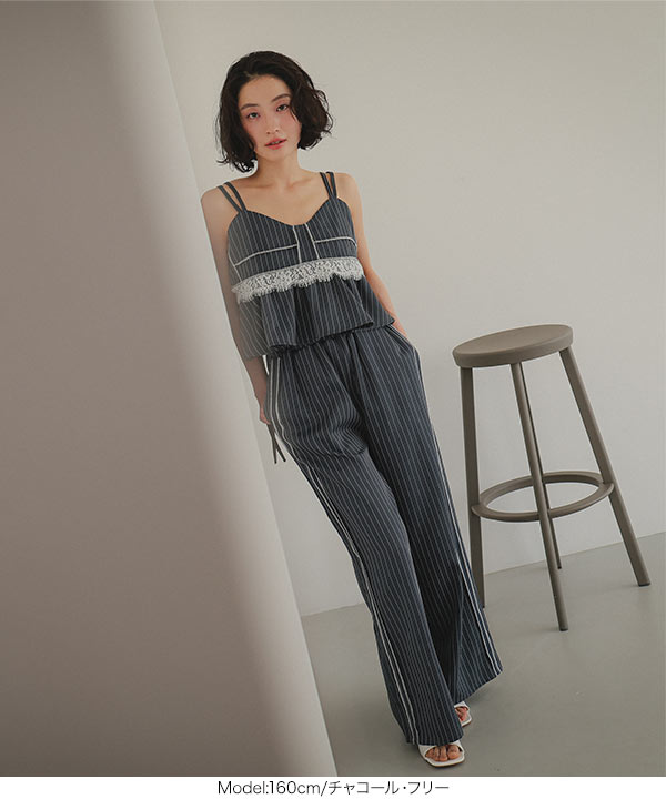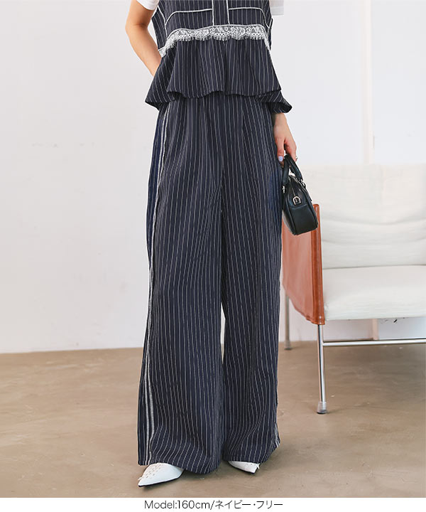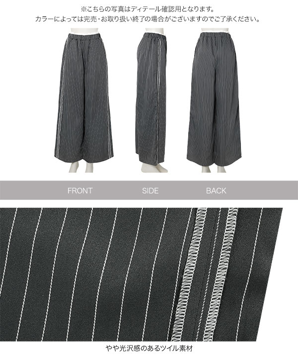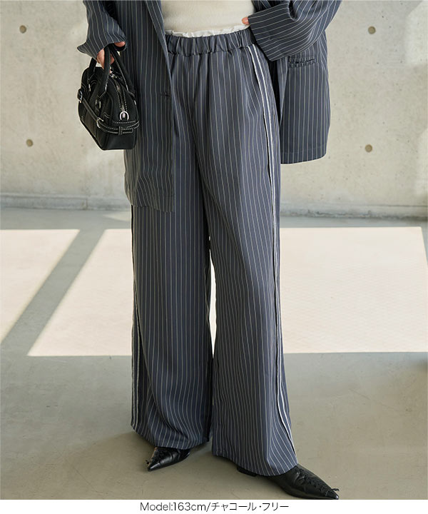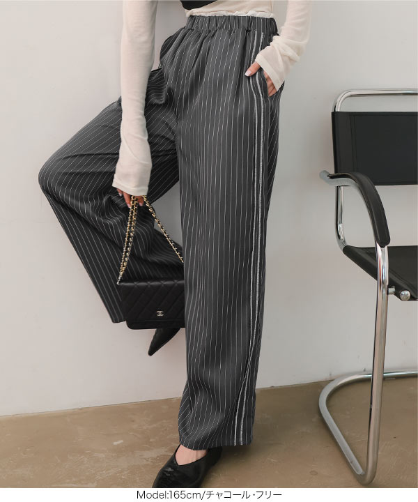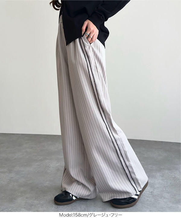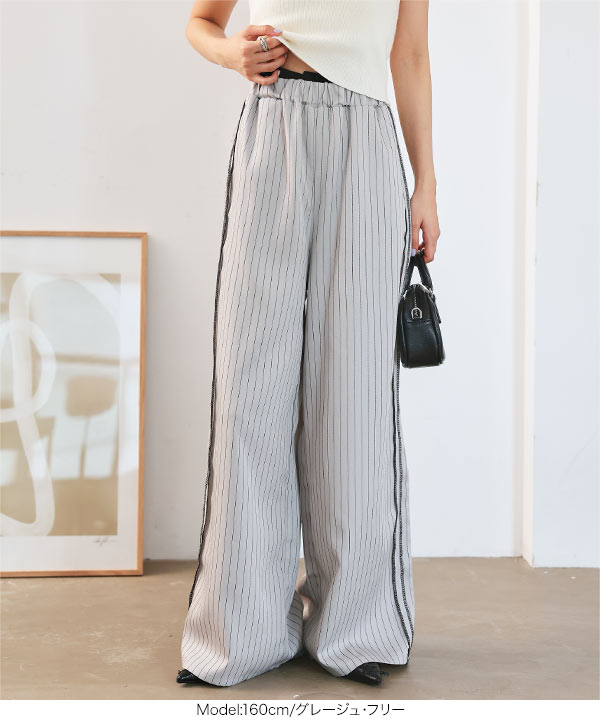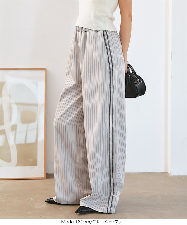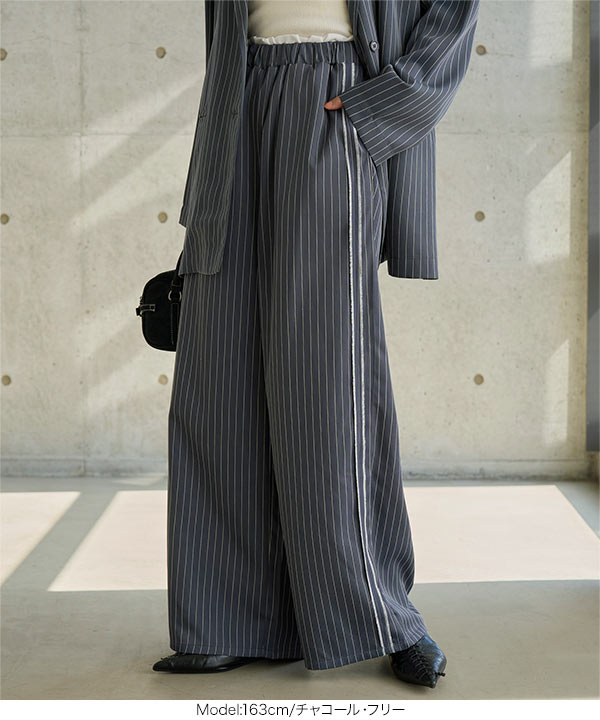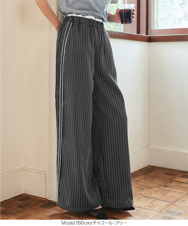 ストライプ柄とサイドラインが縦のラインを強調しスタイルアップ見えも叶えてくれるワイドパンツです。