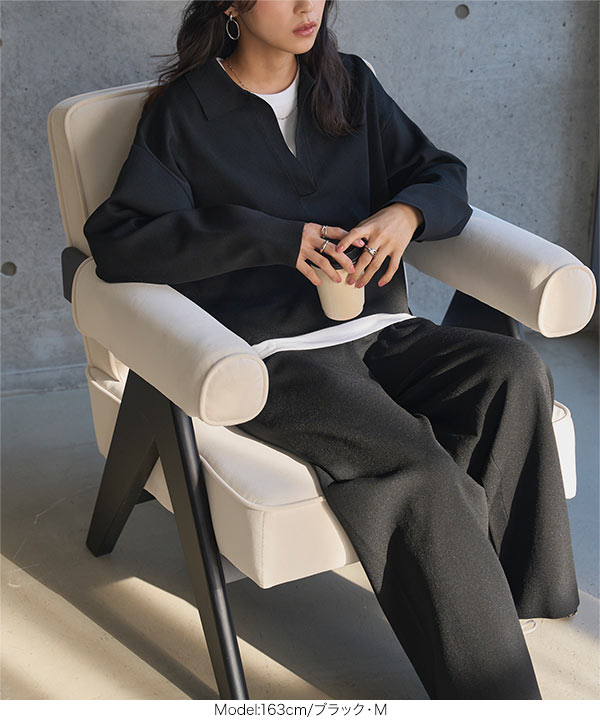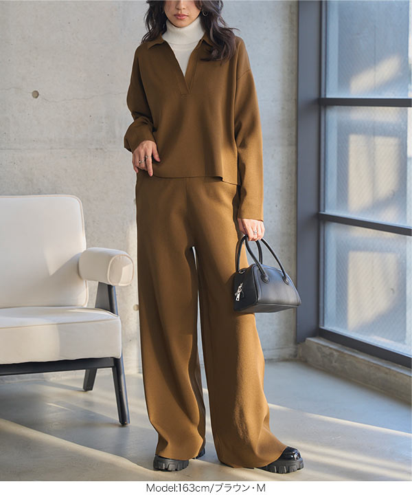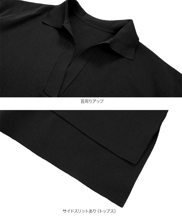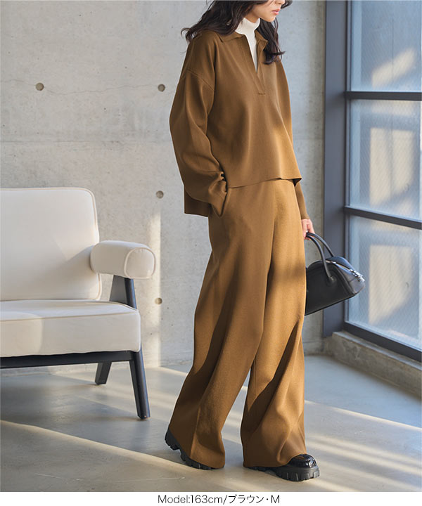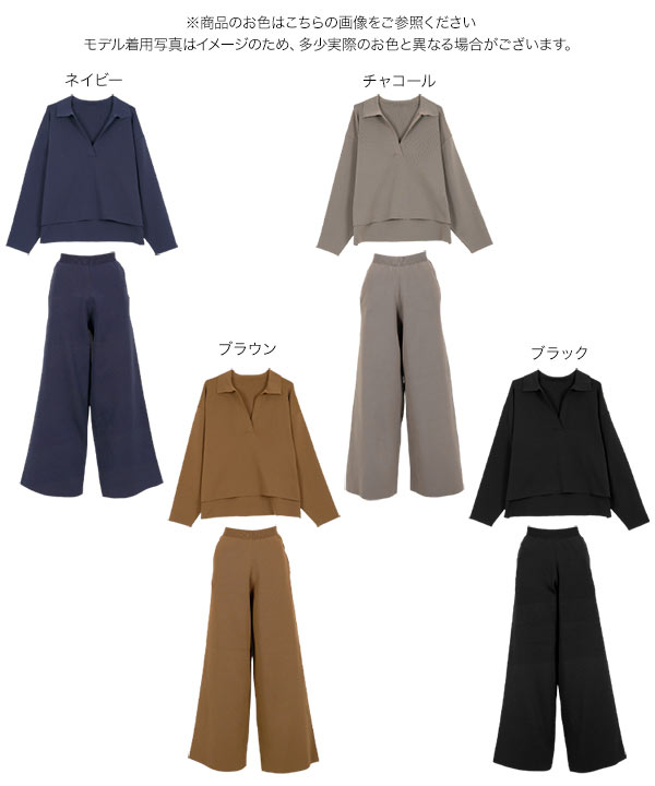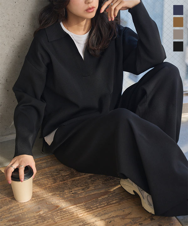 ワイドパンツ スキッパー ニット セットアップ トップス スウェット リラックス 旅行 おしゃれ スポンディッシュ N1237