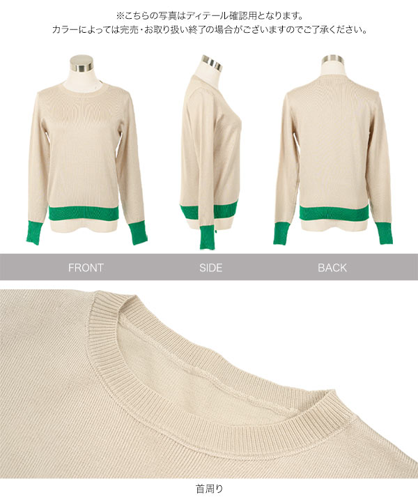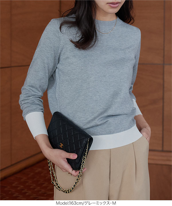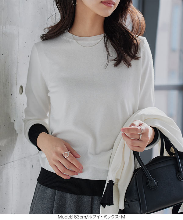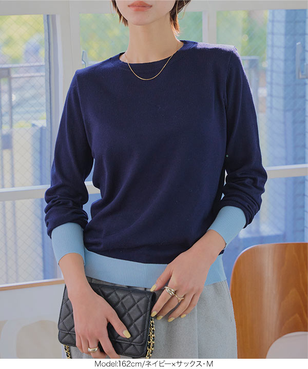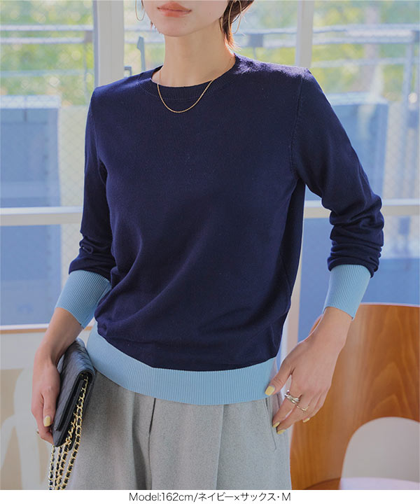 ニット レディース 長袖 セーター トップス 40代 50代 バイカラーニット ベーシック 丸首 ハイゲージ N1258